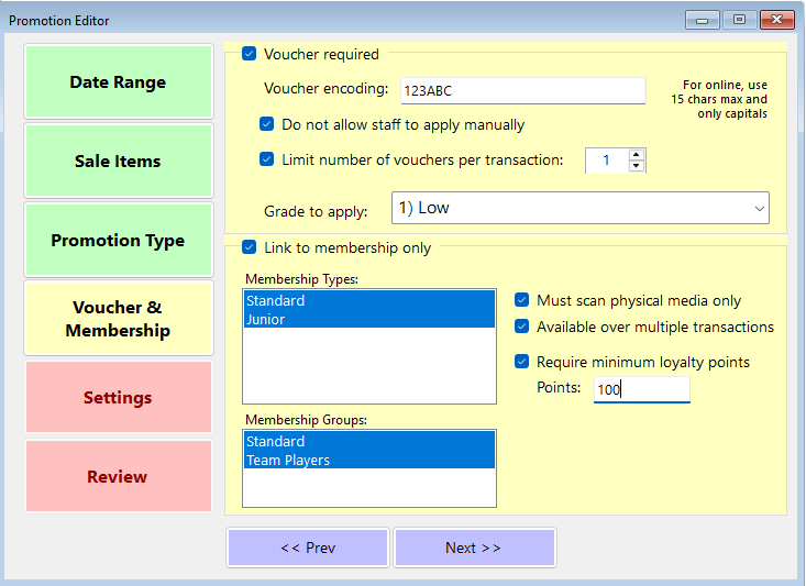 If you have membership enabled you can specify that a voucher promotion is linked to membership only. This can be restricted to specific membership types or groups and means that unless a member in one of the selected types or groups has been assigned to the current sale, or to the tab being viewed, the offer won’t appear in the list shown below.